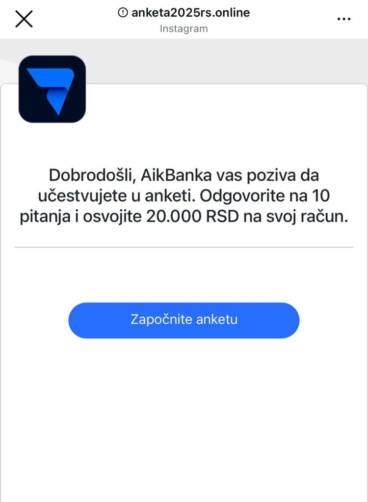 Molimo Vas, ukoliko primite anketu u kojoj se nudi novac za učešće, nemojte kliktati na ove postove i ne otvarajte linkove koji vode ka anketi. Podsećamo vas da nikada ne delite svoje lične i finansijske podatke online.